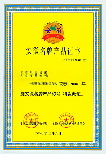 中德牌液压板料折弯机荣膺“安徽名牌产物”称呼