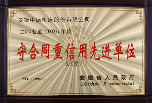 克日,我公司荣获由安徽省国民当局颁发的二〇〇七至二〇〇八年度“守条约重诺言进步前辈单元”声誉称呼(证书号:2009095,有用期止2011年2月),也是我公司第二次取得此项殊荣。