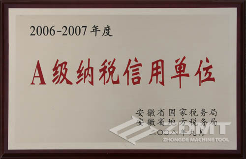 克日,江苏省省之地稅务局、户籍地址稅务局融合惩罚了2006-20010年度消费税信誉等级度品质A级消费税人,中德数控车床也之后被授与了“A级消费税信誉等级度象限”的毕业证书。